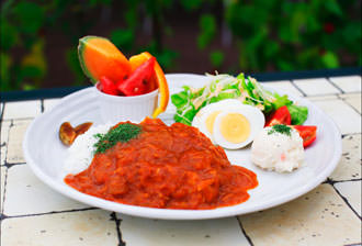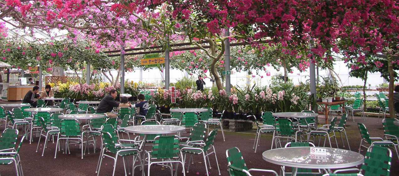 After strolling through the garden, unwind with a leisurely meal beneath the bougainvillea, said to have the largest canopy in western Japan. The space, filled with a tropical atmosphere and vibrant flowers blooming across the ceiling, offers a relaxing setting for dining.