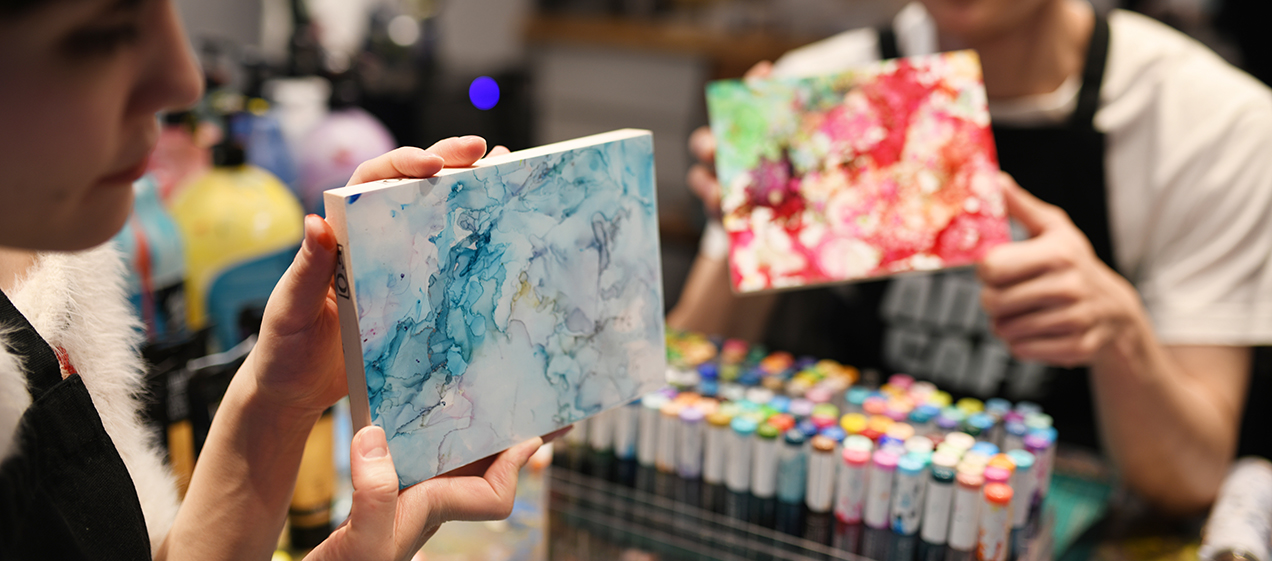 Three unique art workshops are available, each with its own charm and creative appeal: "Tarashikomi Art", "Texture Art", and "Alcohol Ink Art" . Step away from everyday life in a refined setting, enjoy fine music and carefully selected wines, and immerse yourself in the soothing process of artistic creation.