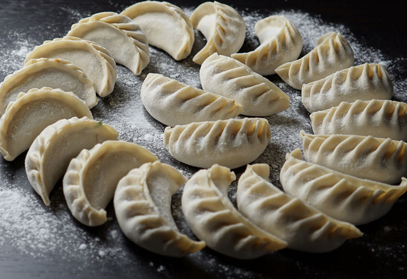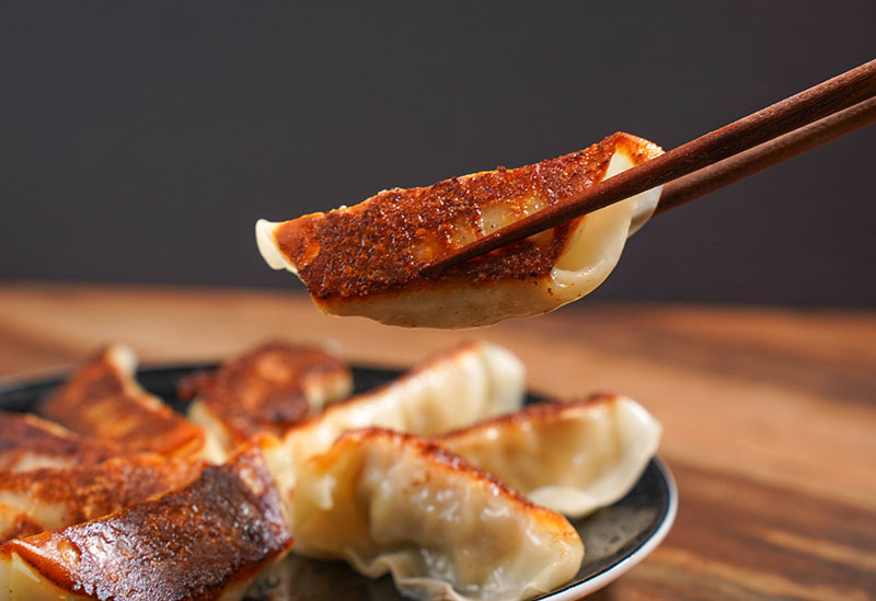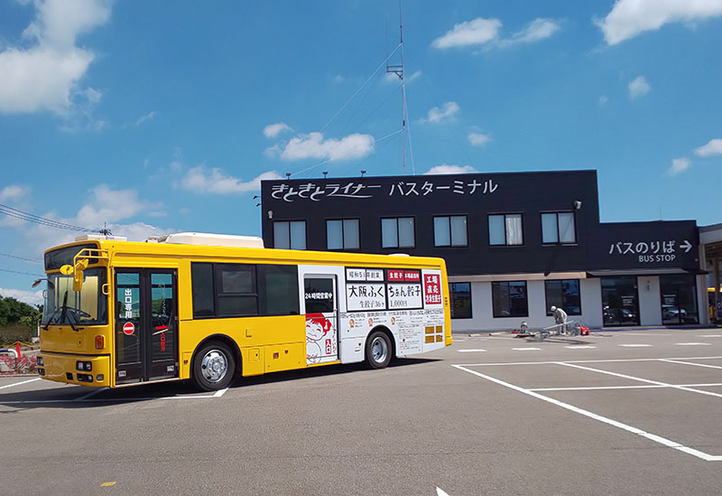 A yellow bus parked at the entrance to "Takaoka Bus Terminal" houses a gyoza shop inside. This unique, unmanned shop is open 24 hours a day and serves Osaka Fukuchan gyoza, made with carefully selected ingredients and featuring a crispy exterior and juicy filling.