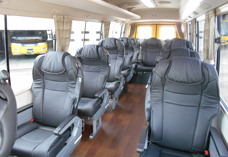02. Micro premium buses feature comfortable leather seats and USB ports for charging.