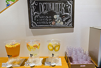 Several kinds of "Detox Water" made with fruits and herbs such as citrus, jasmine, and rooibos are available to drink freely. It is a welcome service that provides hydration before the sauna and gently quenches your thirst afterwards. Each visit may bring the chance to discover a new flavour.