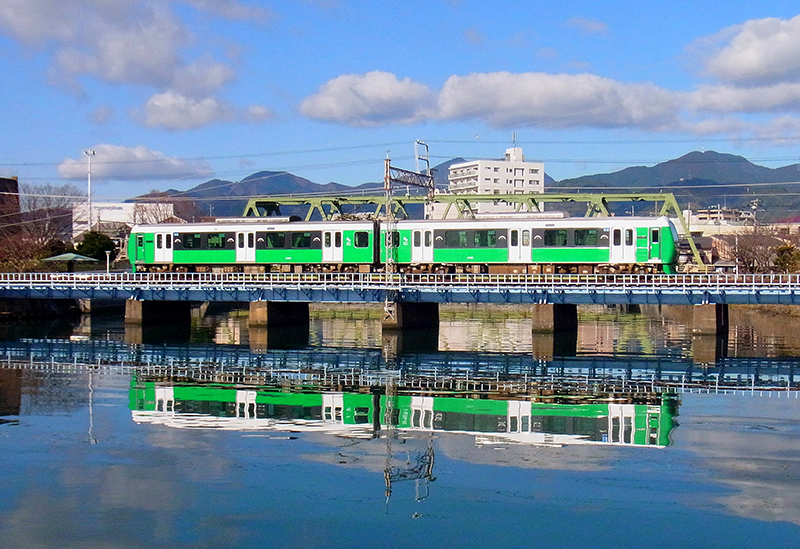The Tomoe River is the point the train passes just before arriving at its final destination, Shin-Shimizu Station. It is an impressive viewing spot where trains can be seen up close as they cross the railway bridge from the side road along the river. On clear days, the reflection of the trains on the calm water surface also makes for excellent photography.