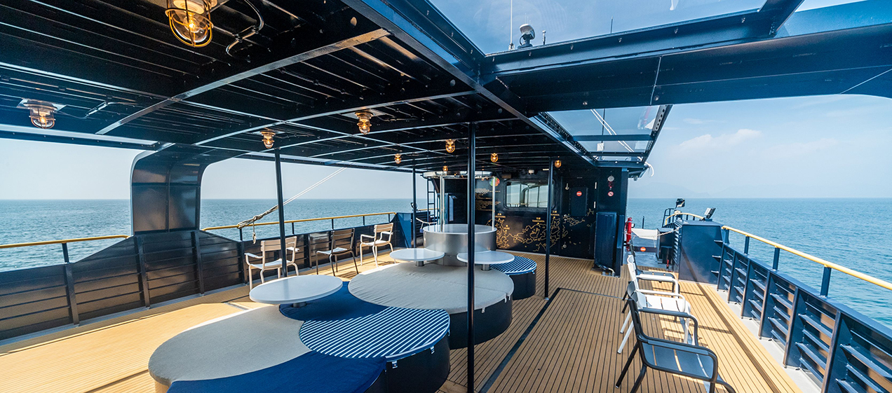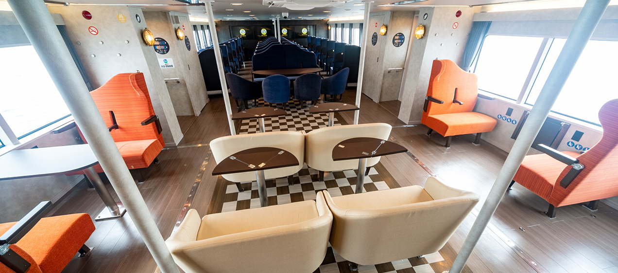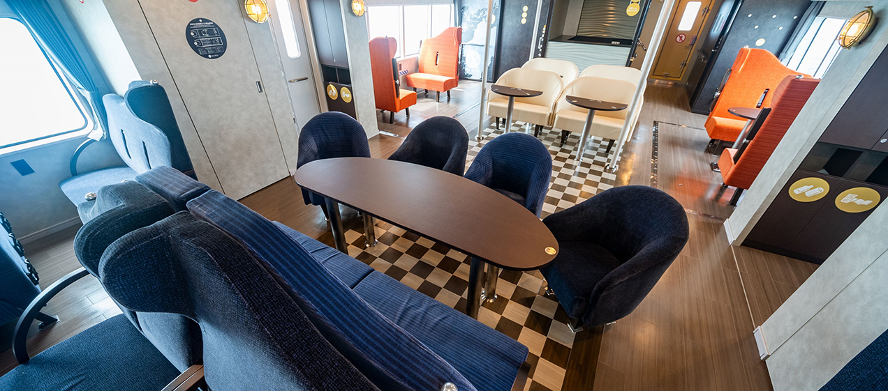 The interior is thoughtfully designed down to the chairs and cushions to create a close connection with the Seto Inland Sea, with barrier-free access that allows comfortable boarding for older guests. On the second-floor deck, sofas inspired by the islands of the Seto Inland Sea are arranged, offering flexible seating for taking in the surrounding views.