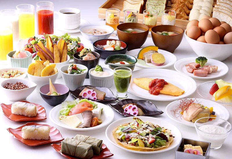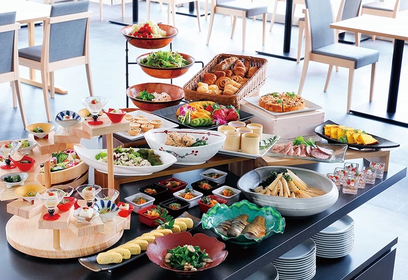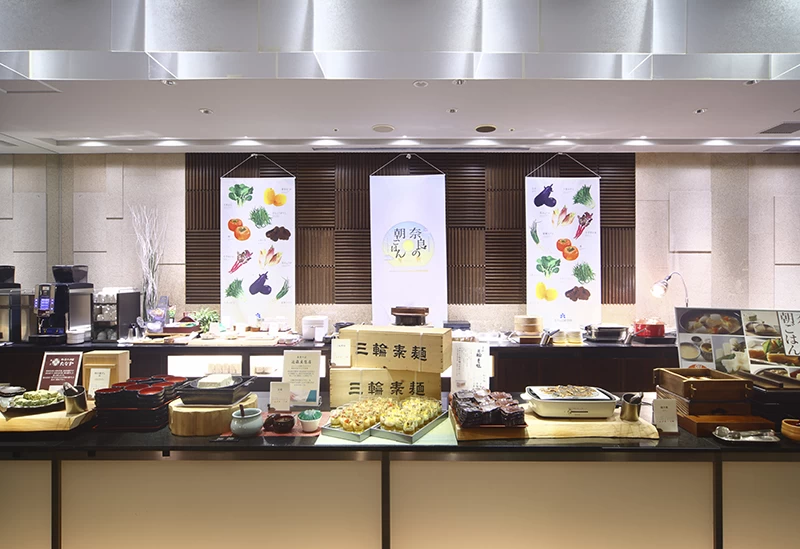 The breakfast buffet features local ingredients and traditional dishes such as persimmon leaf sushi, chagayu (rice porridge made with tea), and kasu-jiru (soup with a sake lees base)—a specialty from Kofukuji Temple made with local sake lees. Guests can also relax in the Welcome Lounge with complimentary drinks, including Nara’s local sake and wine.
