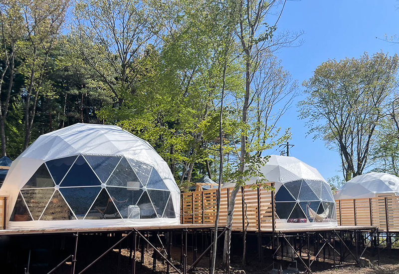 Opened in 2023 on Kesennuma Oshima Island in Miyagi Prefecture, this hilltop retreat offers a serene escape with panoramic views of the sea and mountains. Guests can enjoy glamping and camping in a stunning natural setting. The glamping area features three dome tents, each with its own private sanitary building (including a washroom, bath, and toilet.) Each tent is uniquely themed to create a soothing atmosphere, and the amenities are thoughtfully selected with female guests in mind. A well-equipped campsite is also available, catering to both first-time and experienced campers. Barbecuing while gazing at the ocean is a memorable experience, especially at sunset when the scenery turns breathtakingly beautiful.