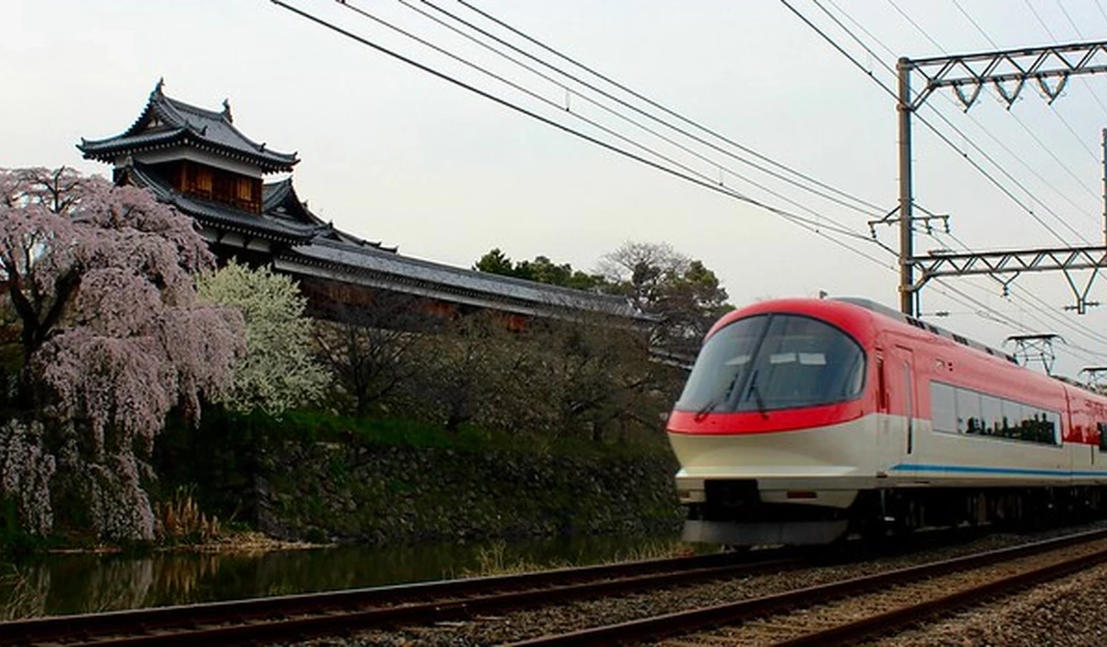 A Kintetsu Urban Liner glides past Koriyama Castle.